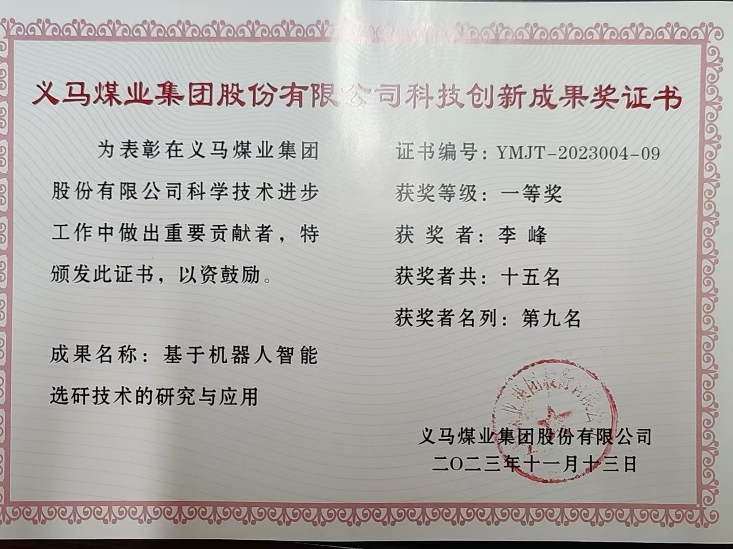 2023-11-13机器人选矸技术获得义马煤业集团一等奖